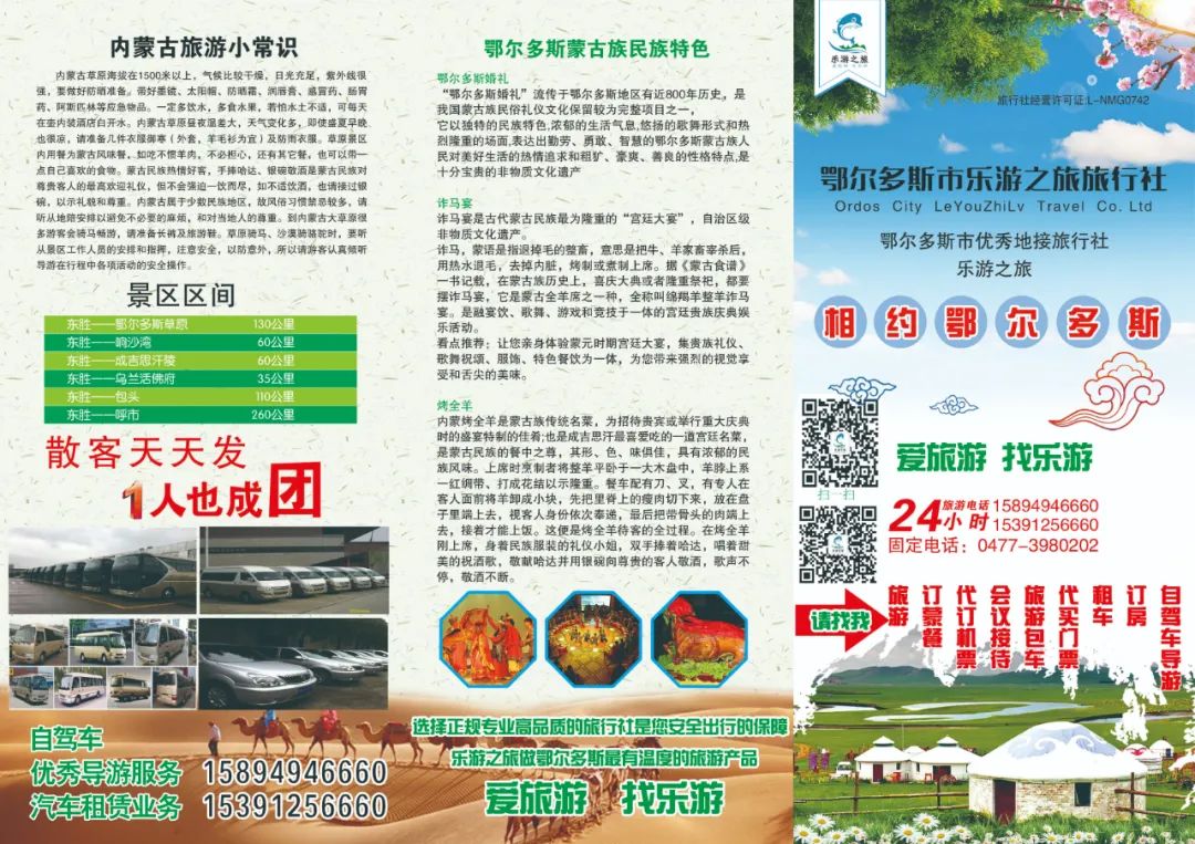 鄂尔多斯市乐游之旅旅行社经国家旅游局审核批准,在内蒙古鄂尔多斯市工商局登记注册、专业从事旅游业务、足额交纳质量保证金及旅行社责任保险、具有独立法人资格的旅行社。2021年被评为鄂尔多斯市AAA级旅行社,2022年被评为内蒙古自治区AAAA级诚信旅行社,是鄂尔多斯市一家以地方接待、外发组团为主的旅行社,主要经营国内旅游、入境旅游业务、商务考察、研学旅行、户外拓展、红色培训、学校户外实践接待、散客接待、承办会议、代订机票、代办租车等各项业务,为各界人士提供优质、周到、超值的旅游服务。鄂尔多斯市乐游之旅旅行社拥有一批经过严格系统培训并通过国家资格认证考试的高素质、业务熟练的经营管理人员和导游服务人员;旅行社秉承“宾客至上、 信誉第一 、诚信旅游“的经营宗旨,深得新老顾客的信任。