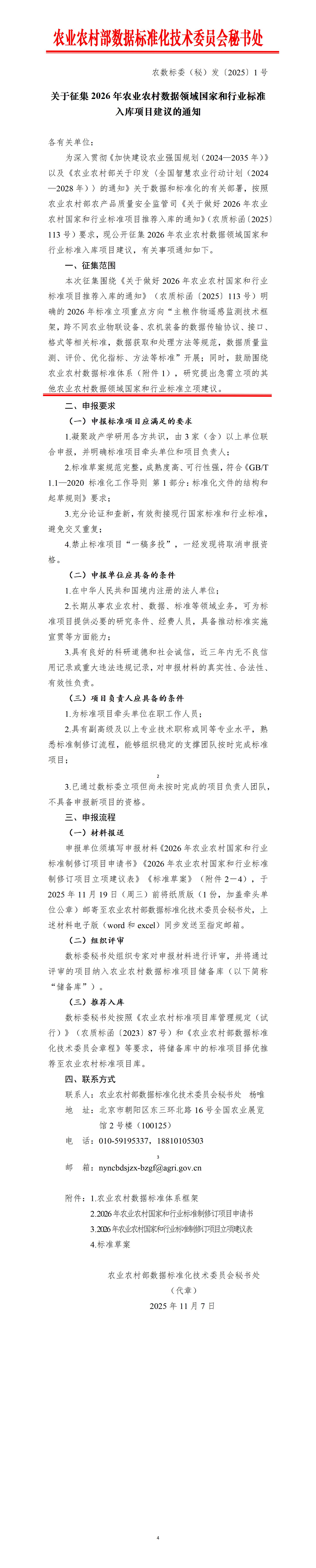 关于征集2026年农业农村数据领域国家和行业标准入库项目建议的通知