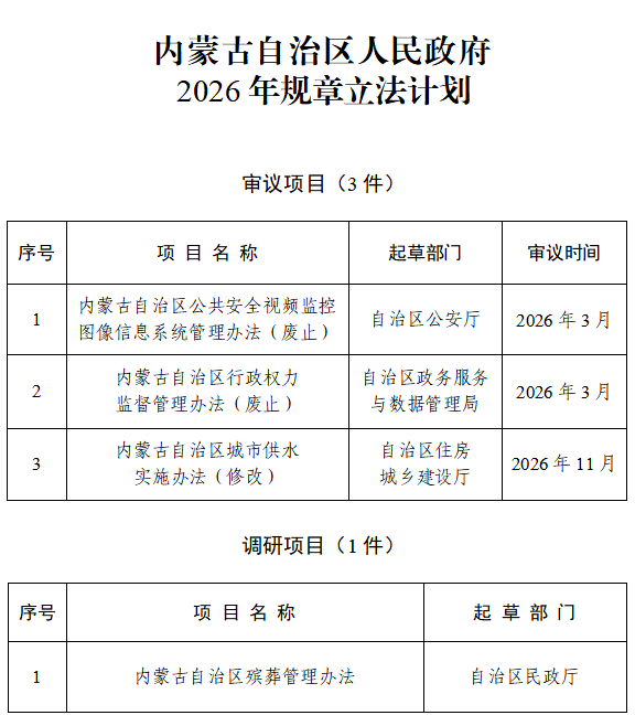 经自治区人民政府同意,现将《内蒙古自治区2026年政府规章立法计划》印发给你们,请认真贯彻执行。各起草部门要按时完成立法项目草案的起草、征求意见、调研、论证、评估等工作;自治区司法厅要依法加强政府立法审查,按时序进度推进立法进程,有效提高立法质量。