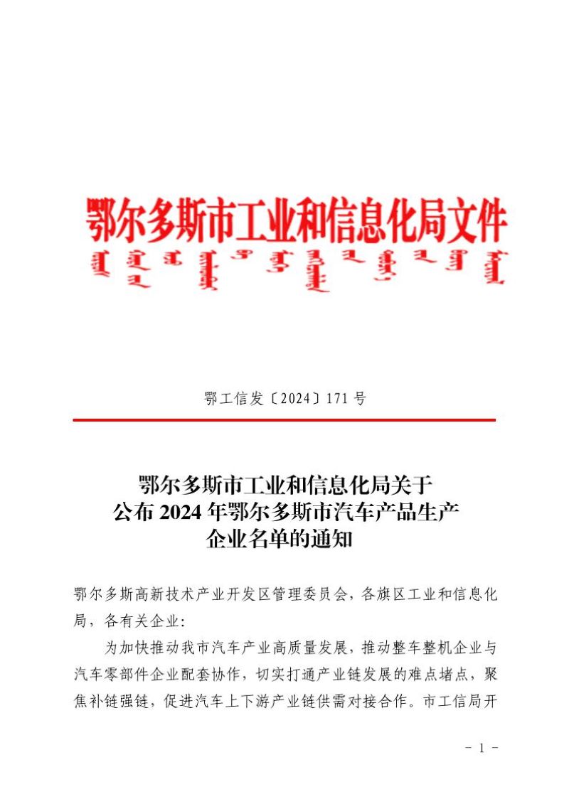 鄂尔多斯市工业和信息化局关于公布2024年鄂尔多斯市汽车产品生产企业名单的通知