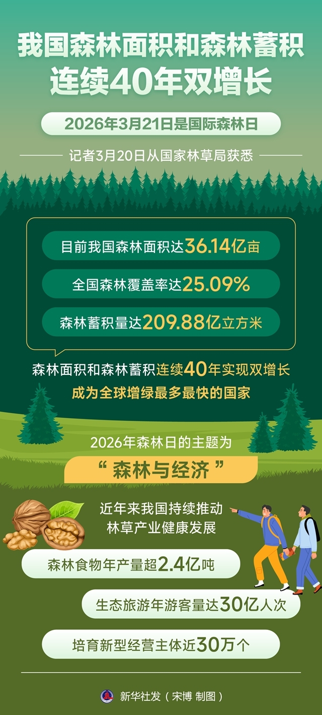 图表:我国森林面积和森林蓄积连续40年双增长