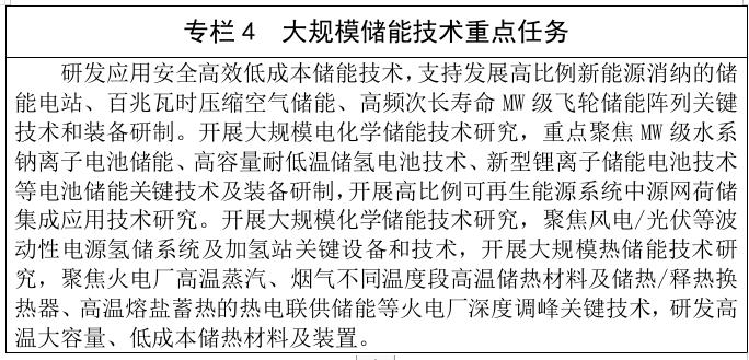大规模储能。推动大规模储能领域技术攻关和相关技术示范应用,推进源网荷储一体化协调运行。发挥大规模储能对于缓解缺电、促进新能源消纳和深度调峰等方面作用,统筹不同调节周期储能技术协调优化发展,推动储能开发模式创新。
